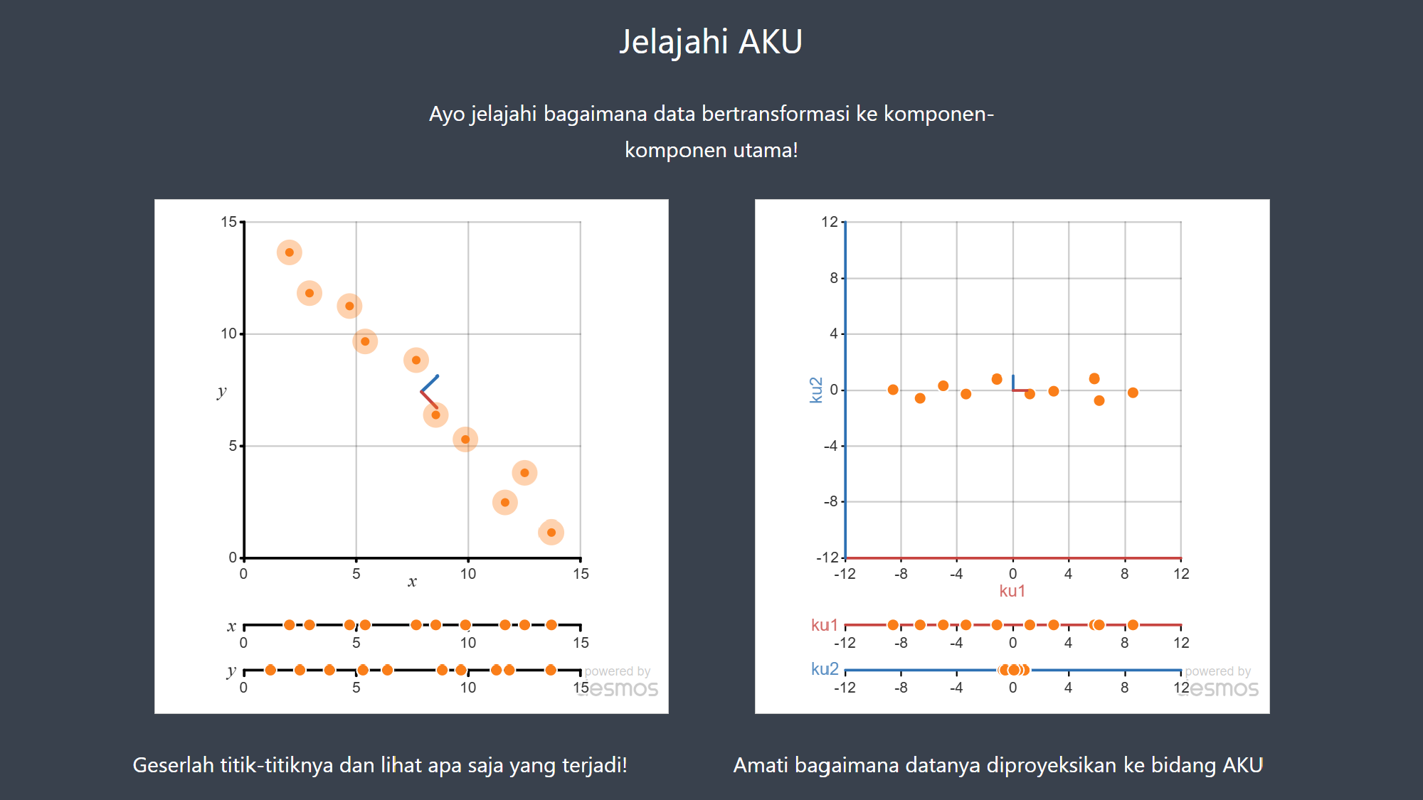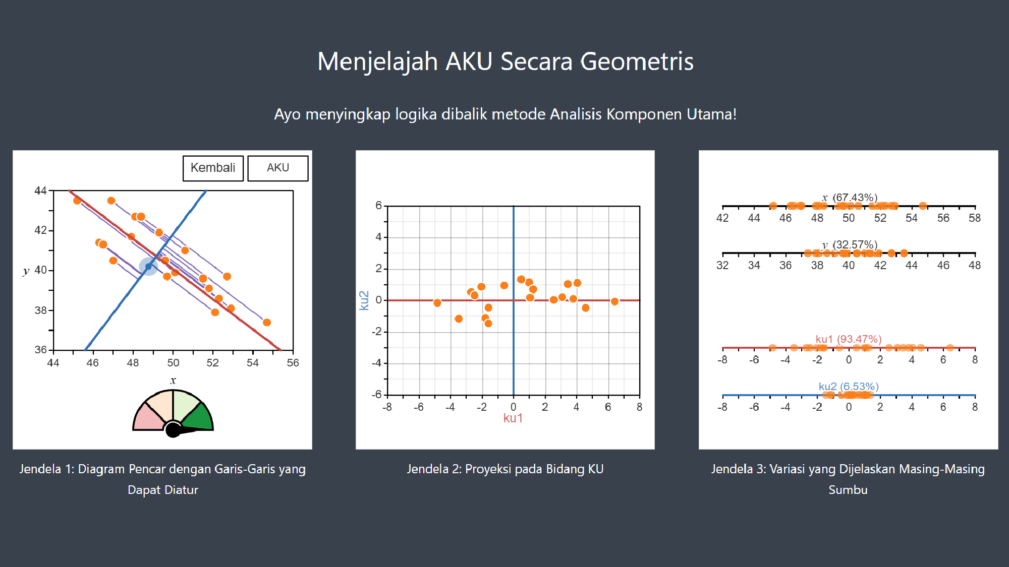 Jika kamu ingin melihat bagaimana ide mendasar AKU, silakan kunjungi media-media interaktif pada laman berikut: Analisis Komponen Utama: Bagaimana Ide Dasarnya? dan Eksplorasi Analisis Komponen Utama, lihat Gambar 1.