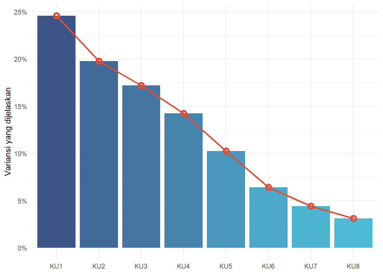 Gambar 2 menunjukkan visualisasi hasil AKU terhadap data tersebut. Gambar 2 (a) menunjukkan komponen-komponen utama yang dihasilkan beserta dengan besarnya variansi data yang dapat dijelaskan oleh masing-masing komponen tersebut. Dari gambar tersebut kita dapat melihat bahwa KU1 (komponen utama pertama) dapat menjelaskan variansi terbesar, diikuti dengan KU2. Dengan demikian, selanjutnya kita gunakan dua komponen utama ini untuk menginterpretasi data. Secara total, kedua komponen utama tersebut dapat menjelaskan 44,35% variansi dalam data.