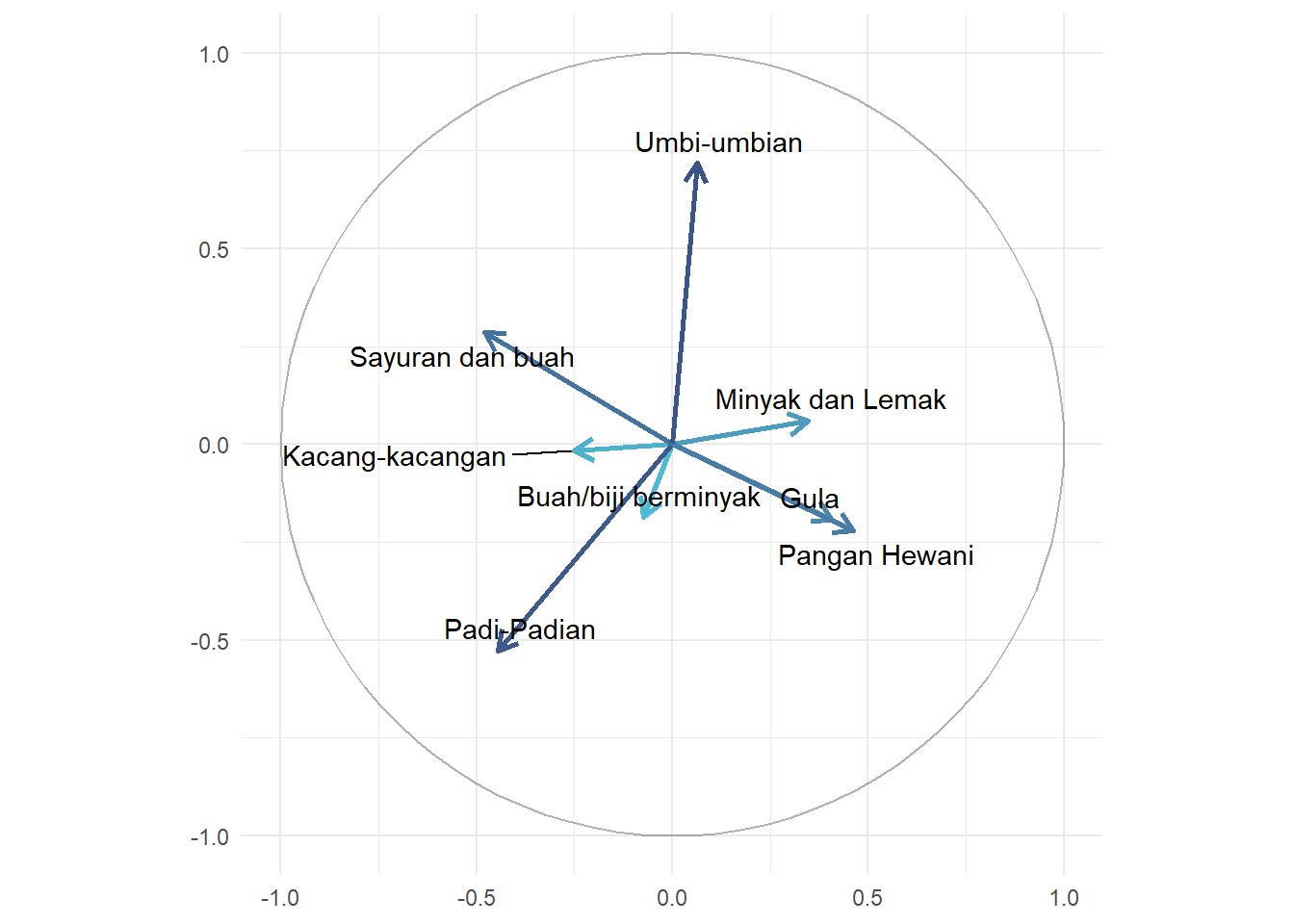 Gambar 2 (b) menyajikan arah dan kekuatan hubungan antara variabel-variabel asli dan dua komponen utama yang pertama: KU1 dan KU2. Misalnya, variabel Sayuran dan buah