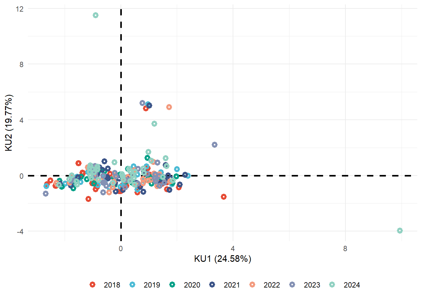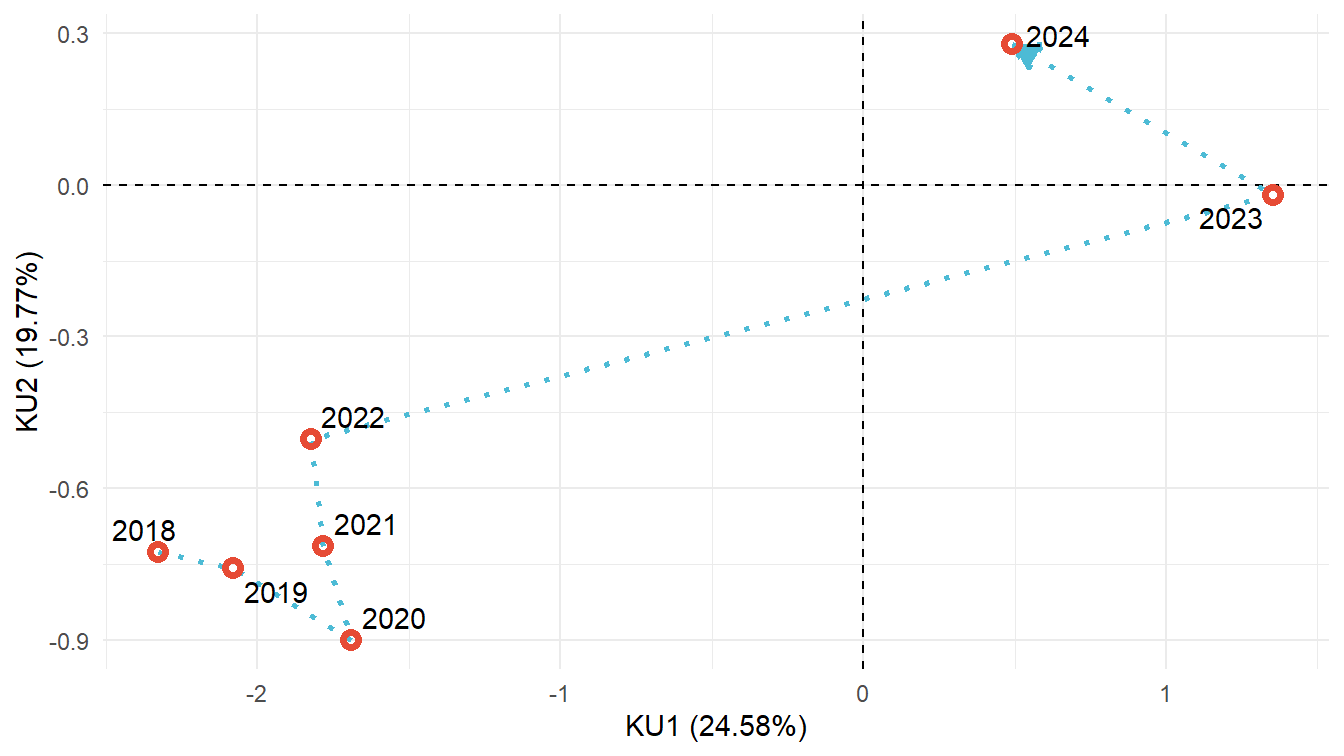 Kita telah mengenal metode statistika multivariat yang ampuh untuk mereduksi dimensi data, yaitu AKU. Hal ini kita lakukan pada Bagian 1. Metode ini kita gunakan untuk mereduksi dimensi data rata-rata konsumsi penduduk Indonesia, yang awalnya memiliki delapan variabel kuantitatif menjadi dua komponen utama saja. Dengan hanya menggunakan dua komponen utama tersebut, kita tetap masih dapat melihat struktur titik-titik data dan variabel-variabelnya. Misalnya dalam Bagian 2, kita menemukan hal-hal menarik tentang titik-titik pencilan dalam data, khususnya untuk Provinsi Kalimantan Tengah pada tahun 2018 dan Provinsi Papua pada Tahun 2023. Selain itu, dengan hanya dua komponen utama saja, kita dapat melihat perubahan konsumsi pangan Provinsi Kalimantan Timur dari tahun ke tahun, seperti yang ditunjukkan pada Gambar 5 dan Gambar 6.