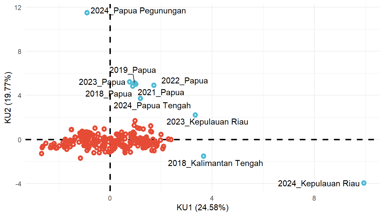 Berdasarkan Gambar 3, kita dapat melihat bahwa titik “2018_Kalimantan Tengah” berada jauh dari kumpulan titik-titik lainnya, sehingga titik tersebut merupakan pencilan. Selain itu, titik tersebut searah dengan tanda panah variabel-variabel Gula