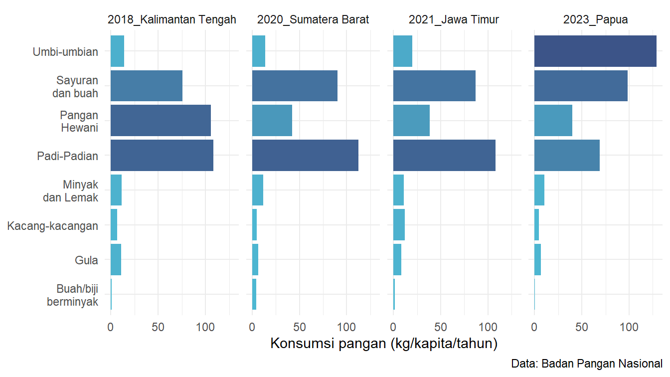 provinsi ini di tahun 2018 lebih rendah dibandingkan provinsi-prinvinsi lainnya.Rata-rata konsumsi pangan Provinsi Papua pada tahun 2023 di kategori