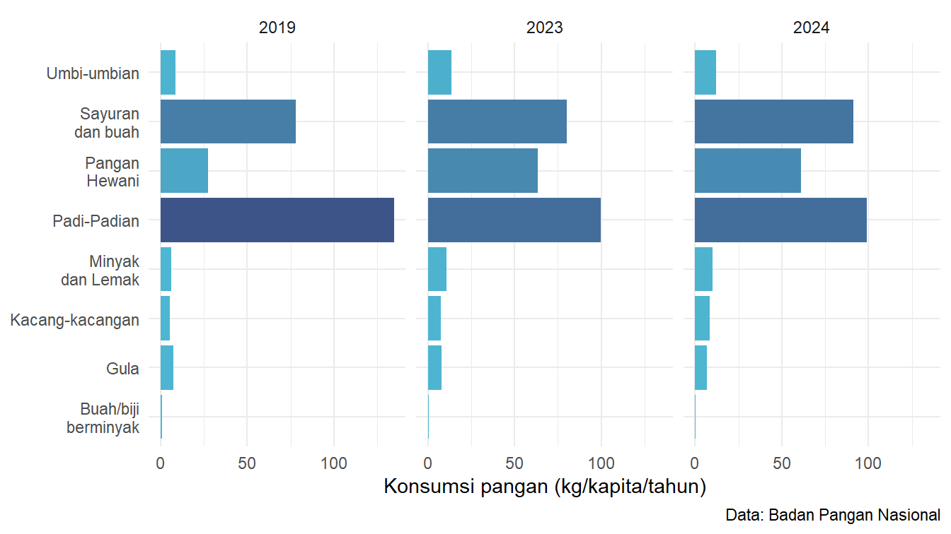 Untuk mengkonfirmasi interpretasi ini, kita dapat membuat diagram batang konsumsi pangan per kategorinya untuk Provinsi Kalimantan Timur pada tahun 2019 (sebagai perwakilan lima tahun pertama yang tersedia di data), 2023, dan 2024. Perhatikan Gambar 6!